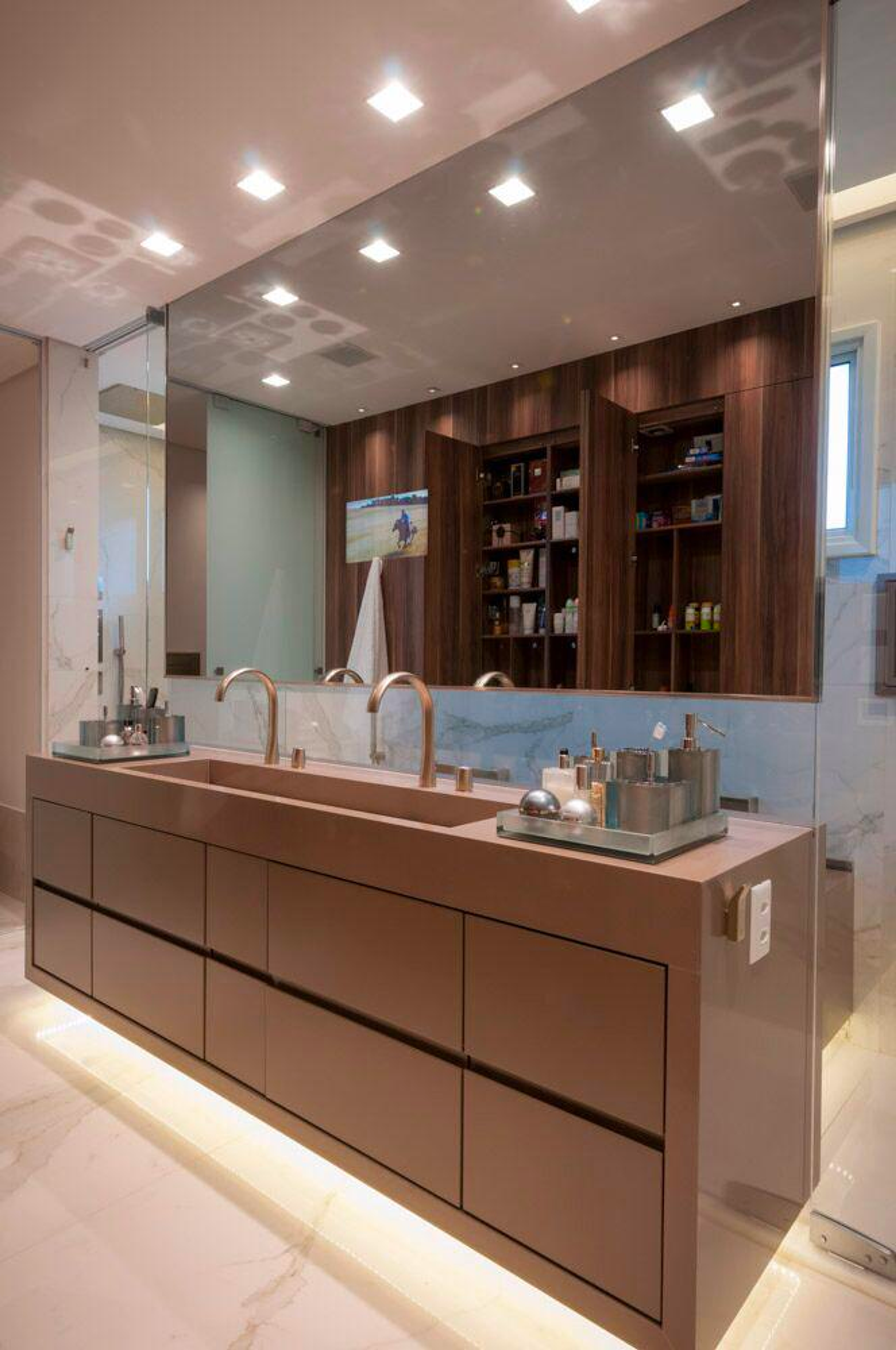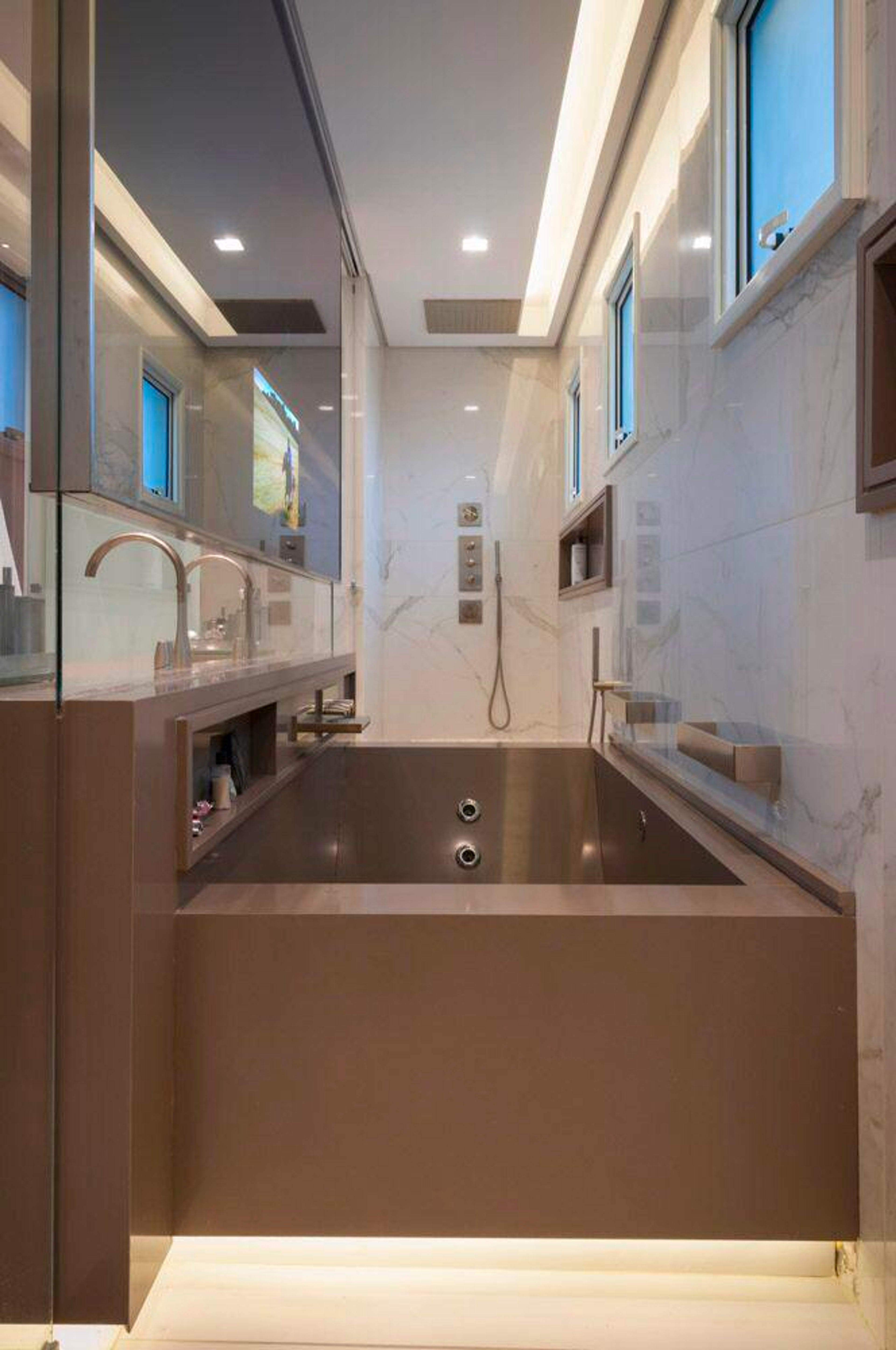 Seguindo o interior da residência, as cores neutras com nuances em verde e azul continuam em destaque e dão apoio à amplitude, gerando uma valorização dos cômodos. Além disso, a mistura dos elementos marmorizados e a madeira transmitem a sensação de aconchego e sofisticação.