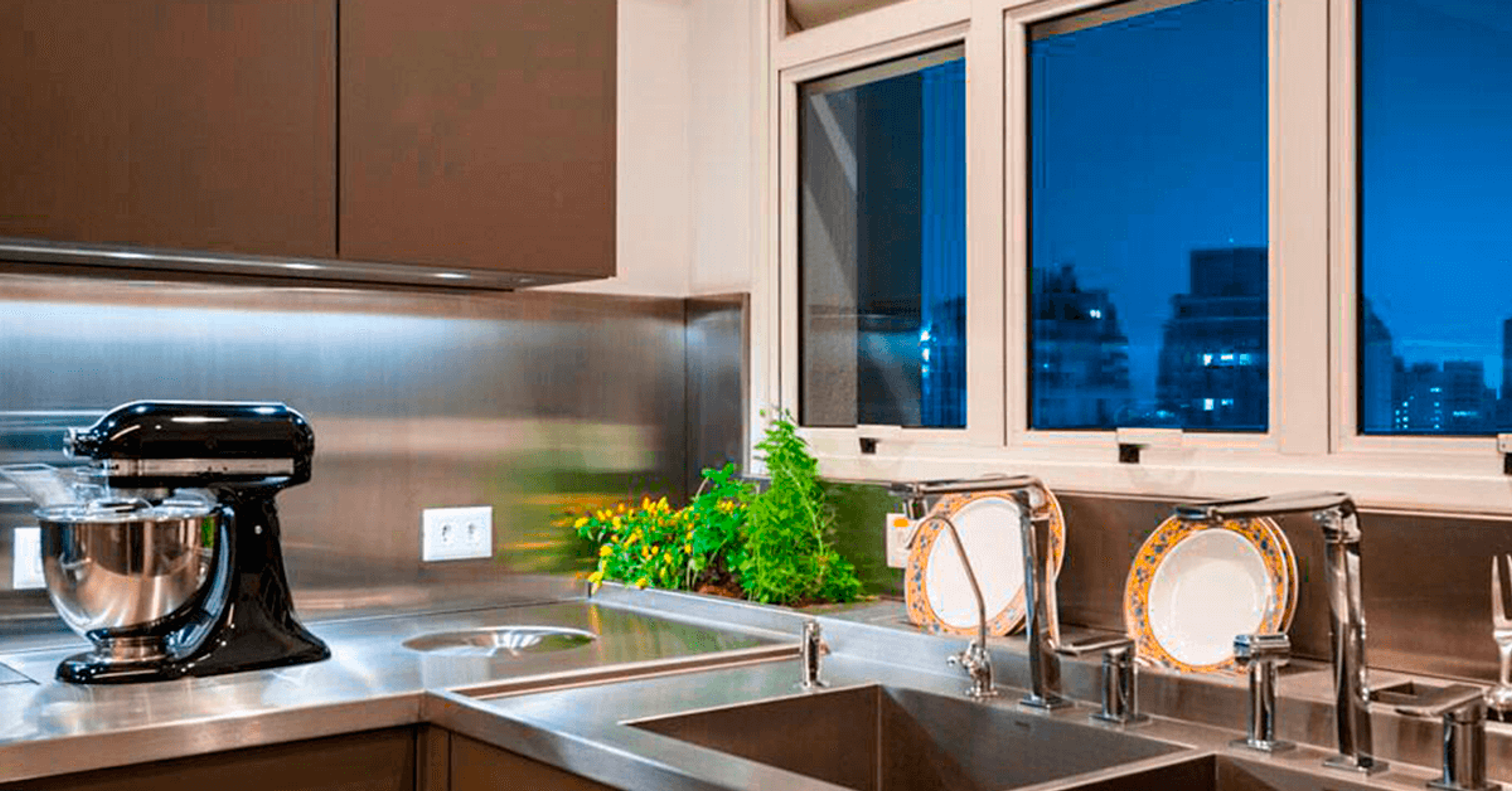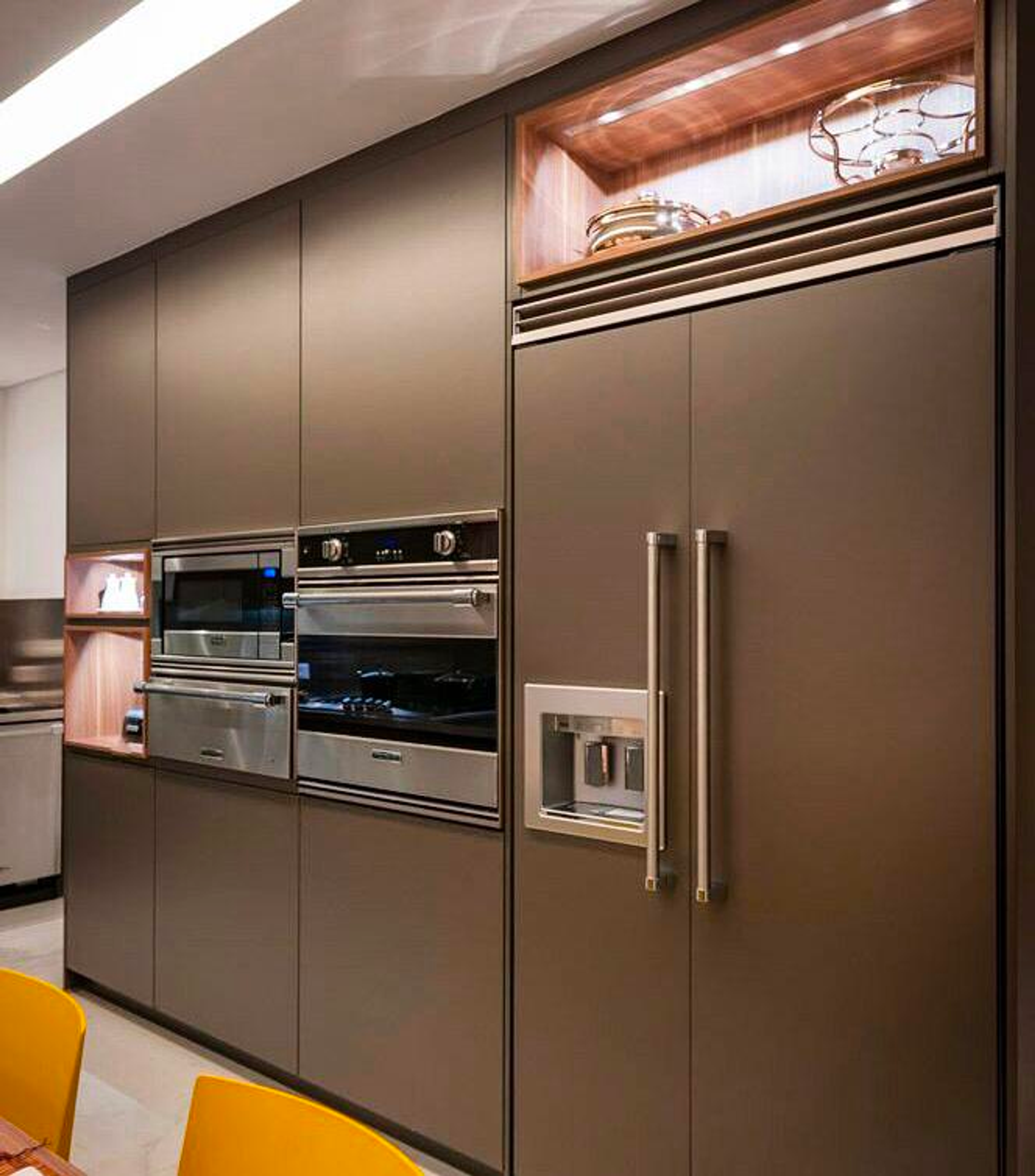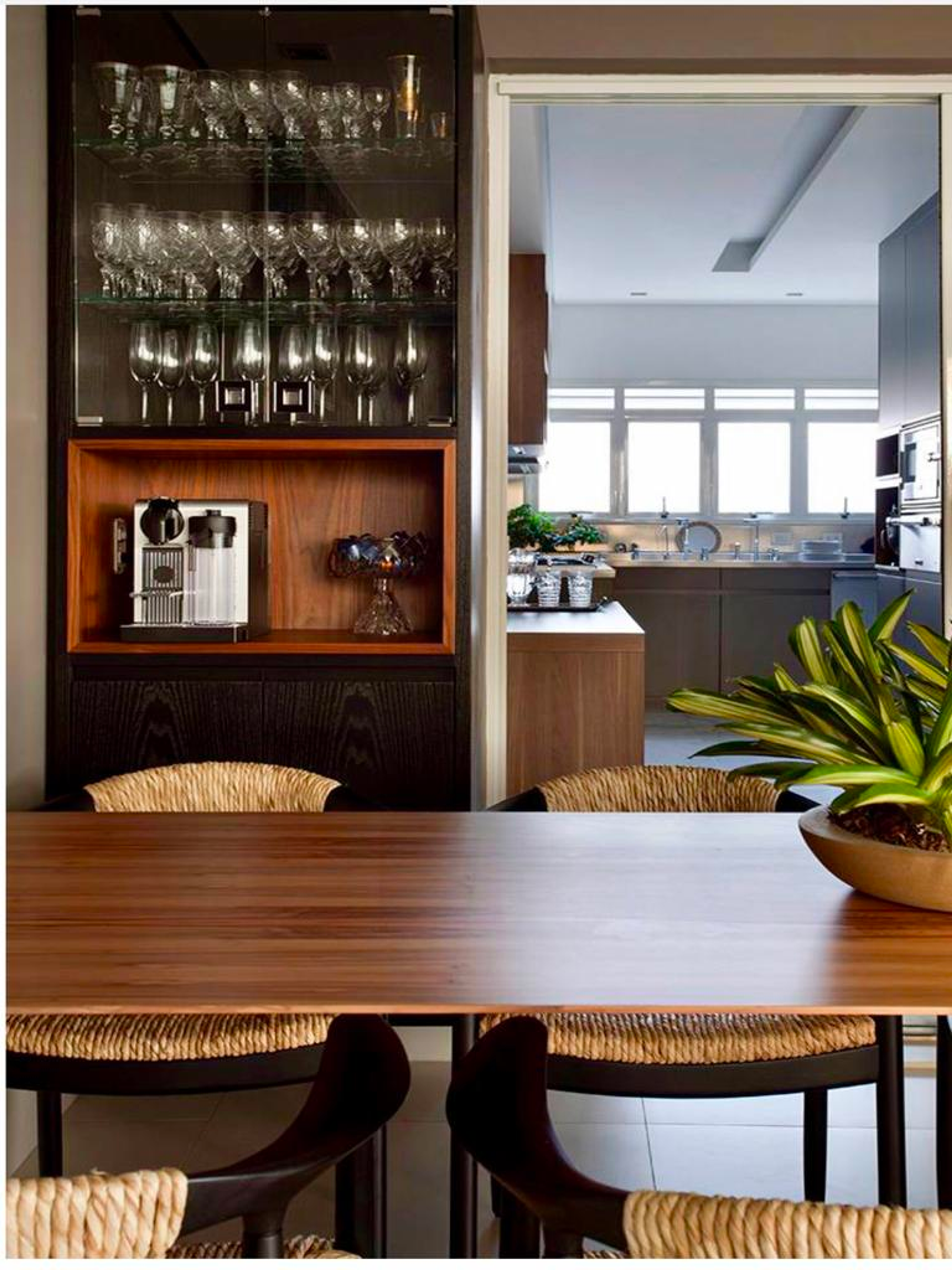 Outro detalhe que encanta é o planejamento evidenciado na cozinha. A modernidade dos aparelhos, com a estrutura e design realçam a identidade despojada e elegante da cobertura.