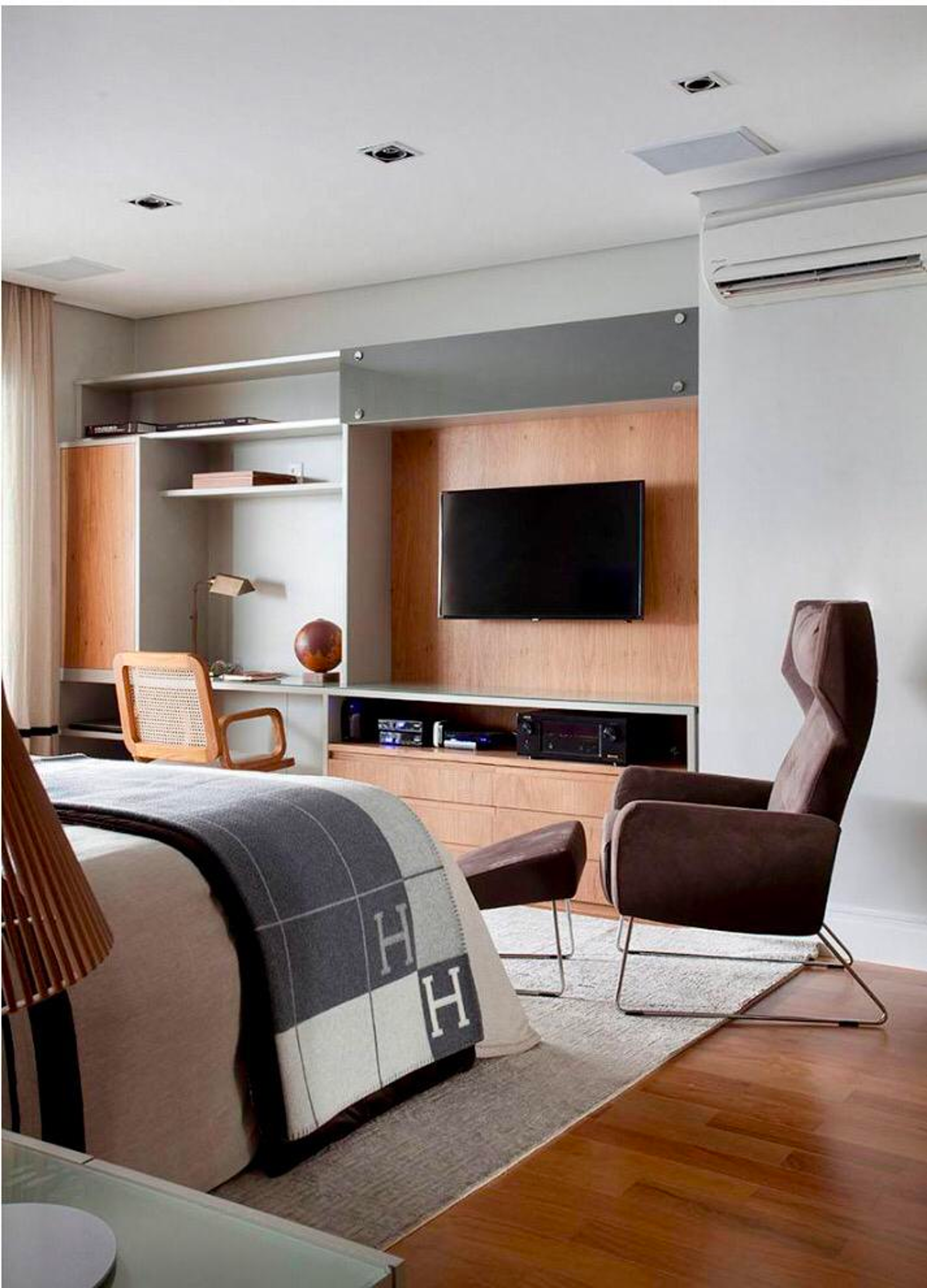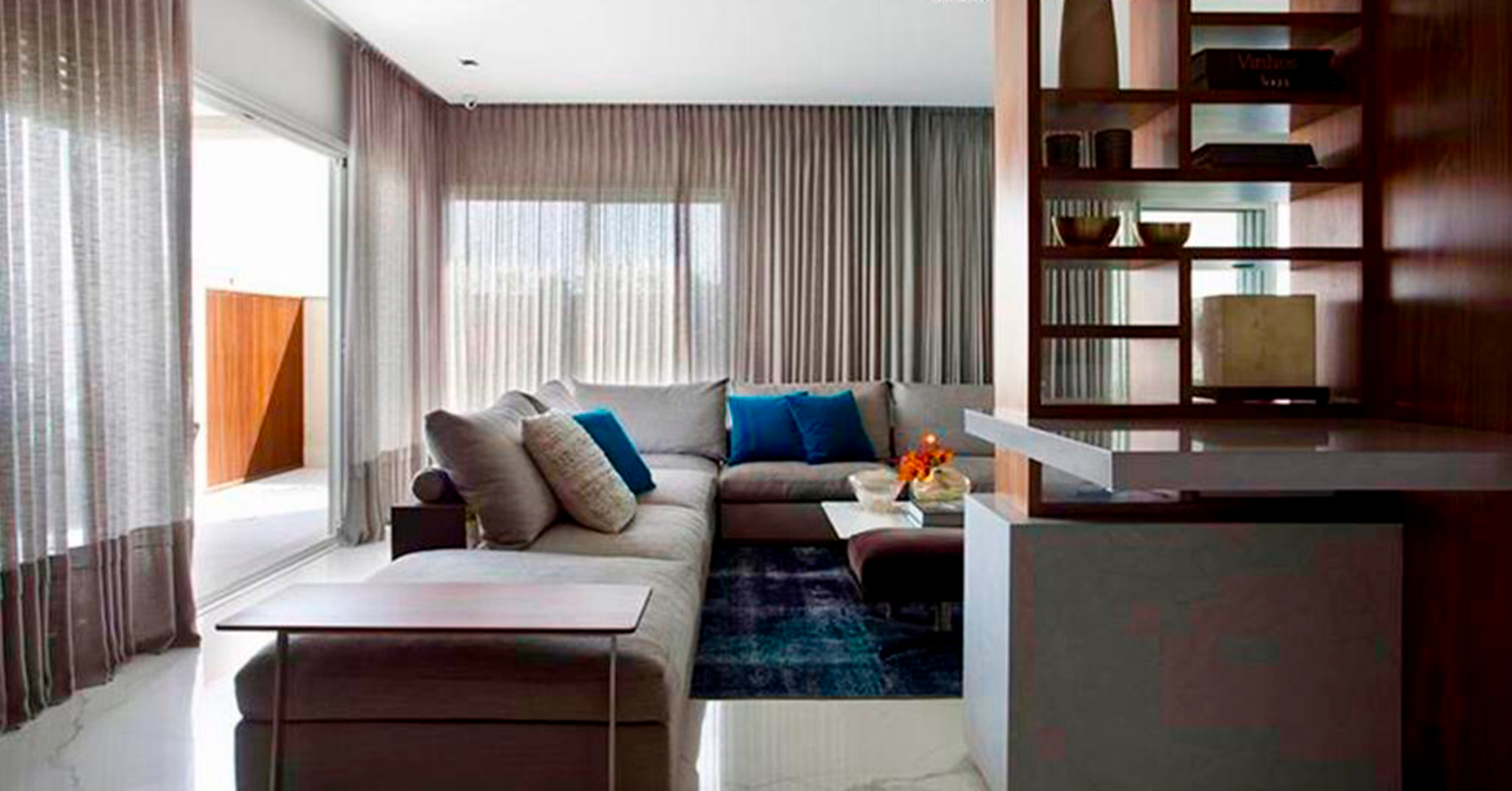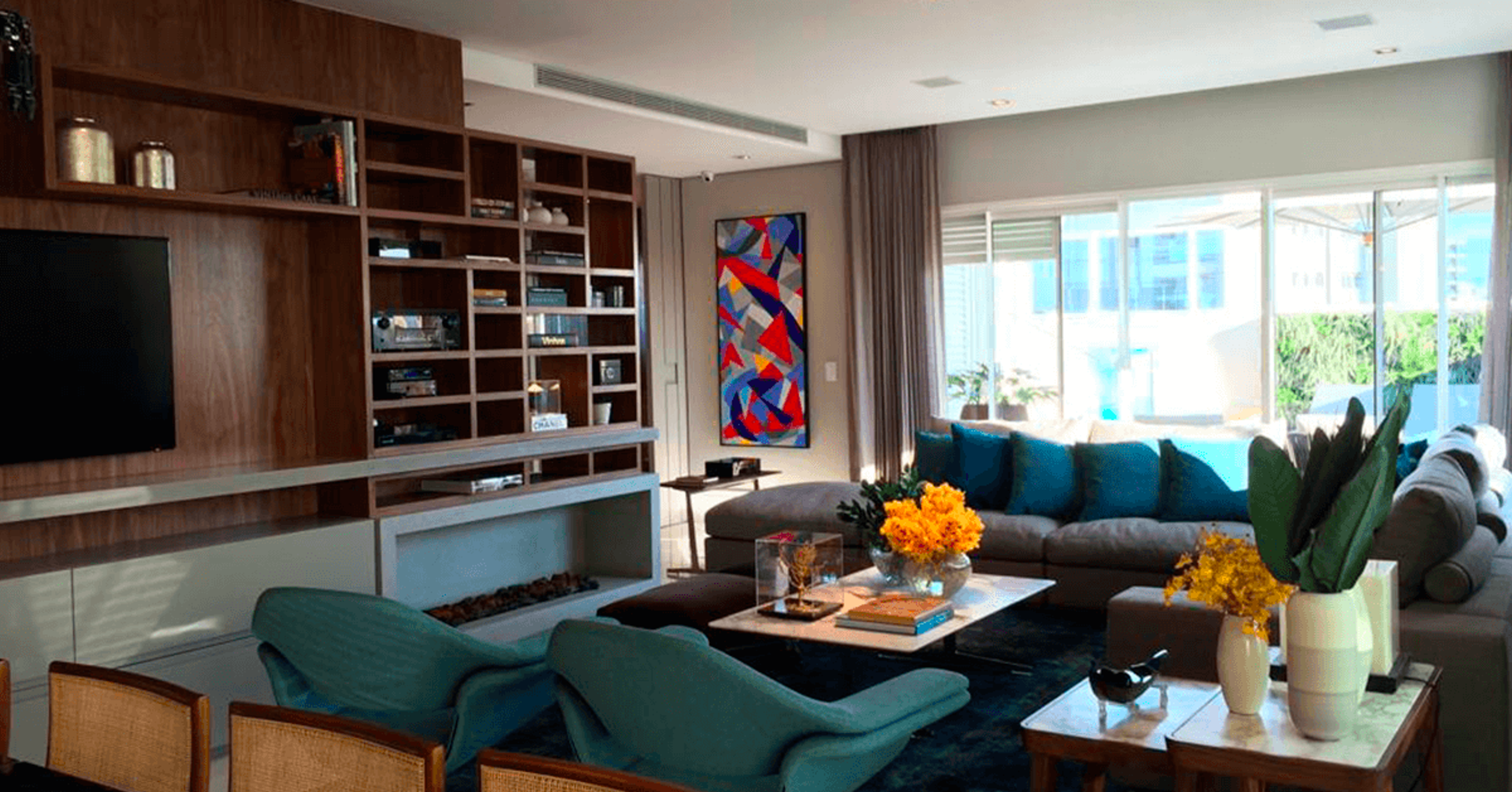 O design atemporal e livre de excessos presente no projeto, exalta a requintada decoração escolhida para compor o luxuoso imóvel. Entre os principais pontos de décor da sala de estar, vemos as obras de arte e móveis assinados.