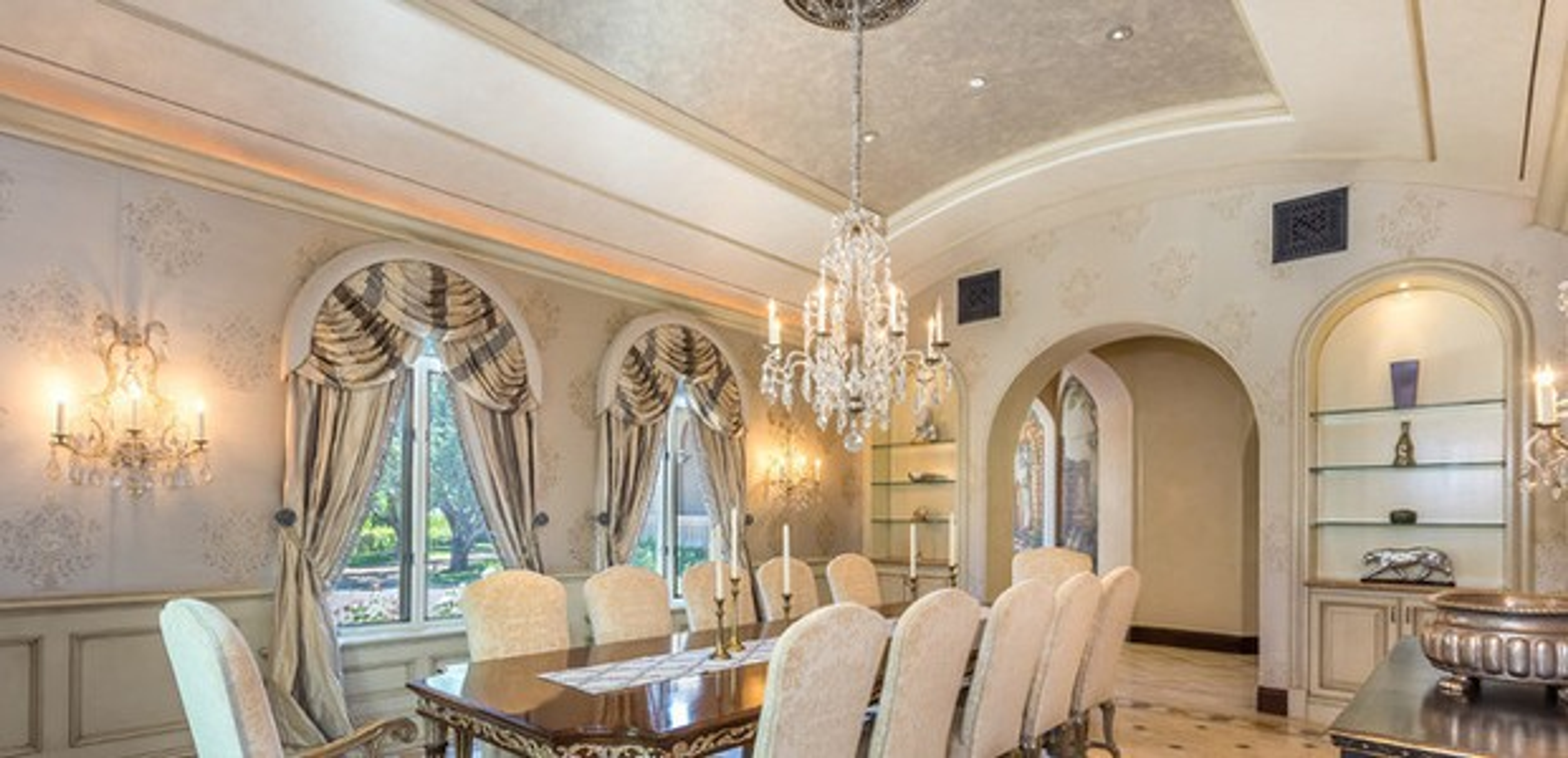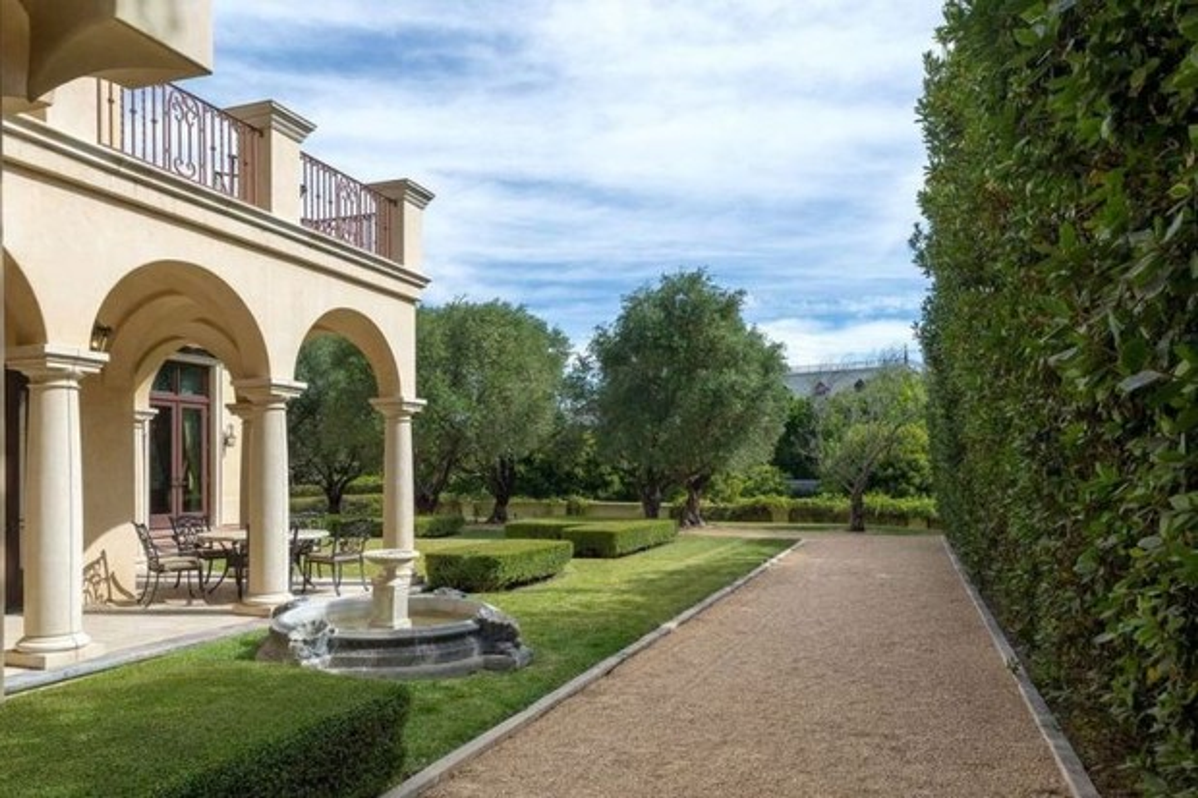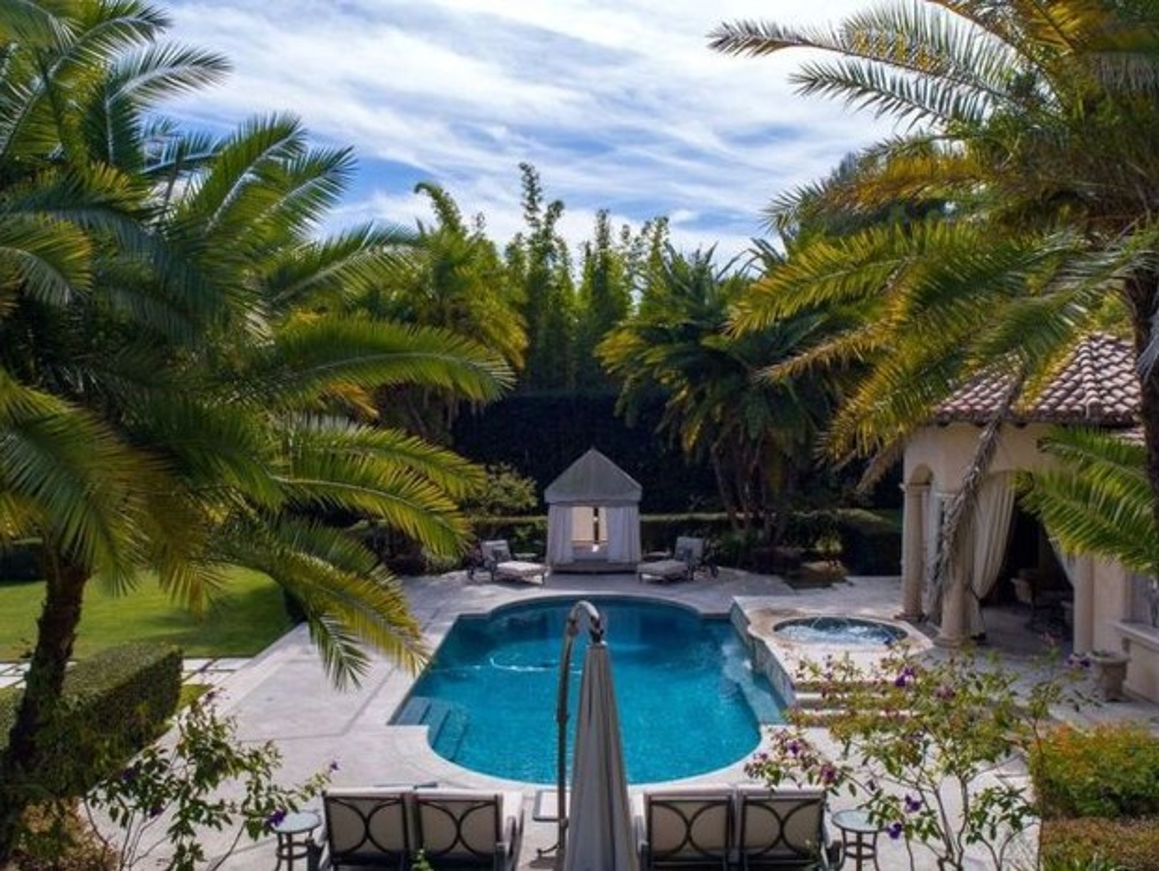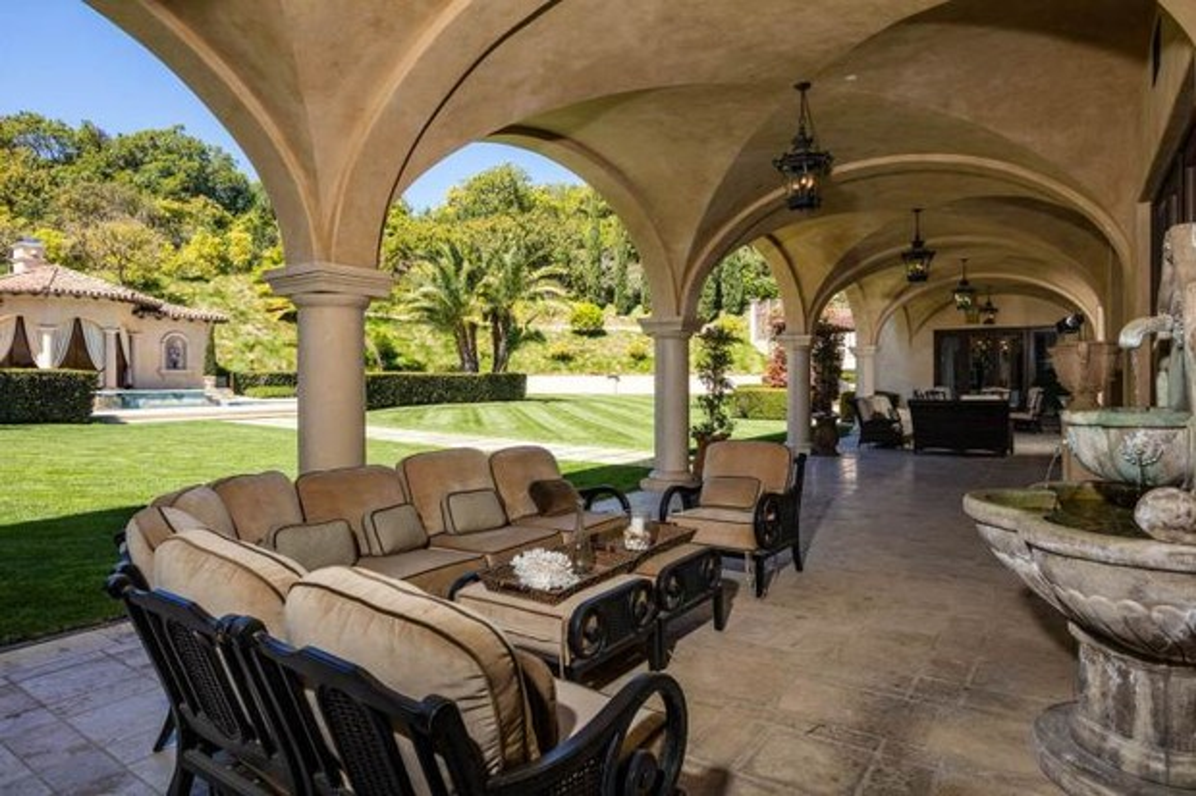 A propriedade tem cerca de 17 mil metros quadrados, e o terreno é divido entre a casa principal, a casa de hóspedes e uma cabana perto da piscina. O espaço tem seis quartos e dez banheiros, cozinha em mármore e lustre de cristais. A área externa é inspirada no estilo palaciano da Itália. O espaço ainda tem quadra de esportes, piscina em estilo grego, academia e cinema exclusivo.